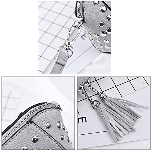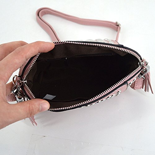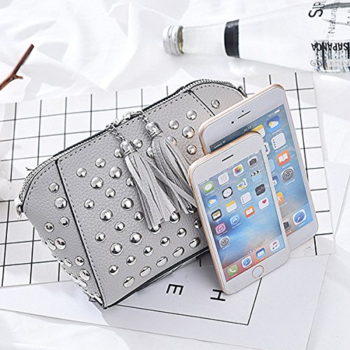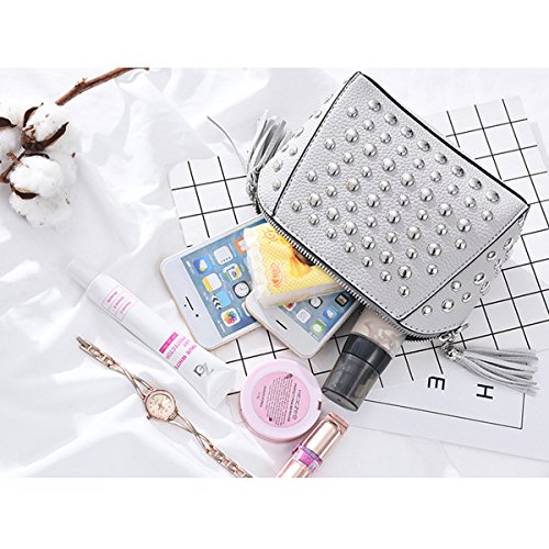 -. Feature : Material: Synthetic leather with fabric lining, silver tone hardware; stylish and durable. / Double zipper closure with cute tassel pendant, Neatly Stitched lining, all over studs,fashion and unique / Structure: Top Zipper Closure, 1 zipper Sandwich pocket in the middle to divide the bag into two compartment, 1 wall pocket for your keys or cards, easily keep your belongings in order. / Style: Attached an adjustable shoulder strap to carry it as clutch purse or as a sling bag; Perfect gift for your friends, wife, lover. ideal for any occasion, such as shopping, party, dating, work, school, travel etc. / Size: The size is approximately 6.3"(L)x2.8"(W) x4.7"(H), A central zippered pocket for carrying your small cosmetics like lipstick, face powder, cologne, and other daily things; please note the size before order.