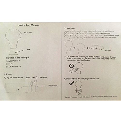-. Brand : WOMHOPE -. Feature : - PRODUCT MATERIAL:Made of composite optical resin and plastic base(Color radom), safe and non-toxic materials / - FEATURE OF PRODUCT:Touch Switch - Between 7 single-color modes and 1 gradient mode. / - MULTI-FUNCTIONALSoft light from the LED , also provides convenience for night operations / - PERFECT YOUR LIFE:specially in the dark or take a photograph, the vision thrill will be strong! / - ATTENTION:Must use our matched USB cable,if have the light flash problem please contact our customer service immediately. -. Label : WOMHOPE -. Manufacturer : WOMHOPE -. ProductGroup : Lighting -. ProductTypeName : HOME_LIGHTING_AND_LAMPS -. Publisher : WOMHOPE -. Studio : WOMHOPE -. Title : WOMHOPE LED Night Light Multi 7 Color Changing Touch Button USB Powered Home Decor Lamp Desk Lamp Gift- Unique 3D Visualization Amazing Optical Illusion