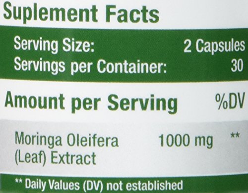 Pure Moringa Oleifera Leaf Extract Capsules; the miracle multiple health pill for your body and mind. Supports weight management, balances sugar levels, reduces cravings, promotes healthy digestion, beautifies the skin and much more. It contains approximately 20 types of amino acids, 46 types of antioxidants, 36 anti-inflammatory compounds - It is a perfect source of bio-available vitamins and minerals like Vitamin A, B, B1, B2, B3, B6, C (Ascorbic Acid), E and Macro Minerals, Trace Minerals, Phyto nutrients. Moringa leaves are a a good source of quality protein & dietary fiber. The miracle moringa tree offers an incomparable amount of natural benefits for your body and mind. Moringa Oleifera, also known in India and Pakistan as soanjhna; In Tamil Nadu, Moringa is known as Murungakkai; In the Philippines, moringa leaves, known as kamunggay, malunggay, kalunggay, or marungay.