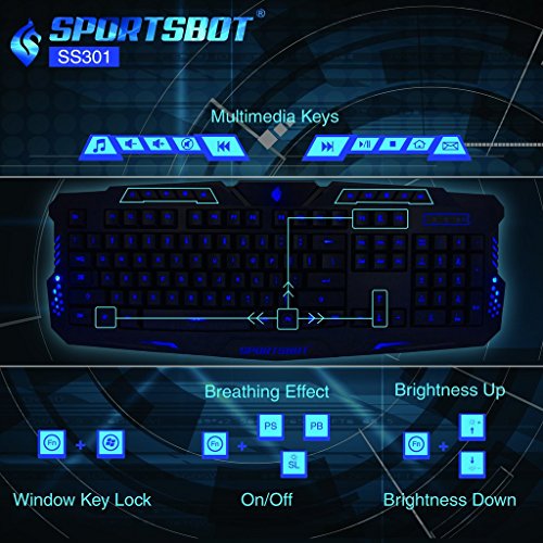 SportsBot®Gaming LED Keyboard - Blue LED backlight w/ breathing lighting effect option. 3 Levels of lighting setting for different light conditions