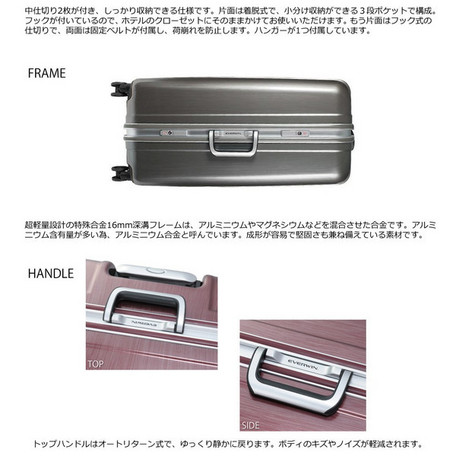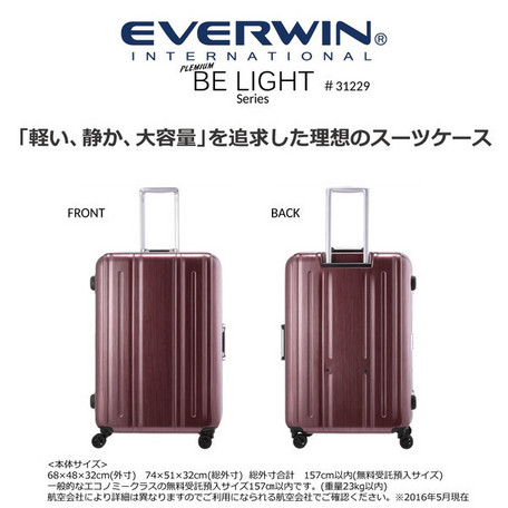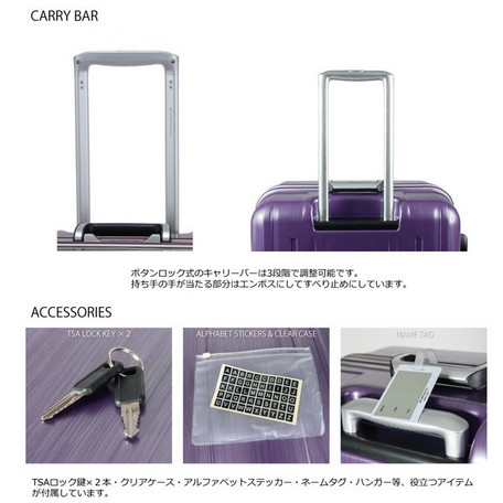 重量制限のみならず、「預入荷物サイズに関する超過料金の厳格化」に対応。(※無料で預入可能な3辺合計158cm以内に規格されておりますが、詳細は各航空会社にお問合わせの程お願い申し上げます)10泊程度の旅行に適した容量で、アメリカ合衆国の渡航に対応したTSAロックを搭載。カギは2本1セット・その他ABCシールを同封しています。