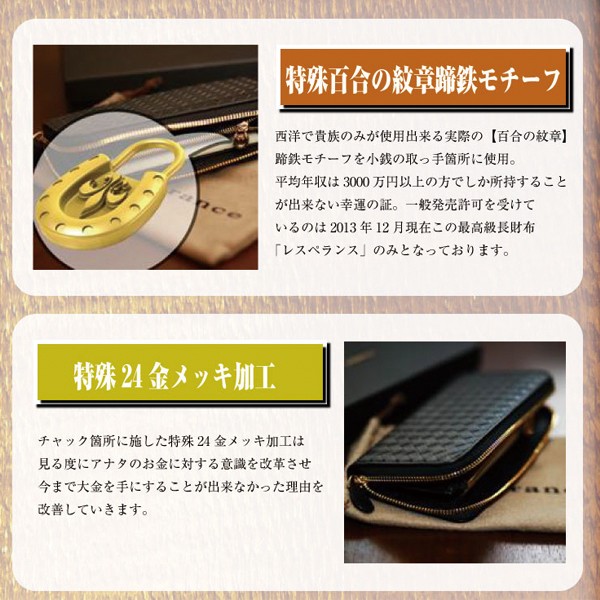 伝説的ヒット商品、イタリア製牛革使用の本物の最高級長財布・・・L'Esperanceレスペランスが再び登場!この最高級長財布は…人気有名ブランドと同様の「イントレチャート」という短冊切りのレザーを編みこんでいく技法を採用。「L'Esperance/レスペランス」に秘められた5つの特徴!01.特殊【百合の紋章】蹄鉄モチーフ 02.特殊24金メッキ加工 03.蛇柄模様 04.漆黒デザイン 05.大型サイズ「L'Esperance/レスペランス」に秘められた5つの特徴を詳しく!