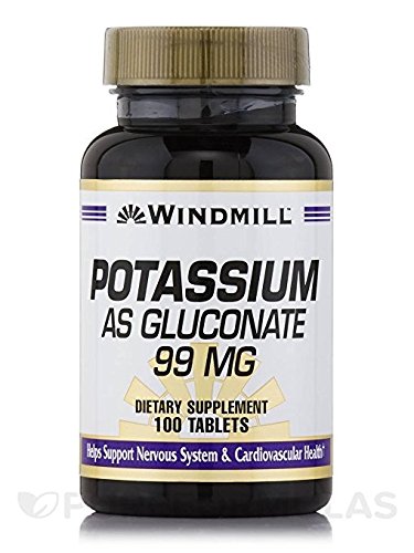 -. Feature : Windmill Potassium as Gluconate 99 mg Tablets Helps support nervous system and cardiovascular health. / Potassium gluconate helps regulate water balance within the body. / It works to control the activity of the heart muscle, nervous system and kidneys. / Helps control activity of the heart muscle.