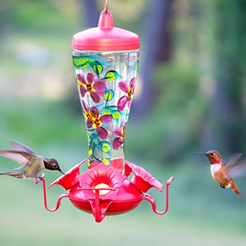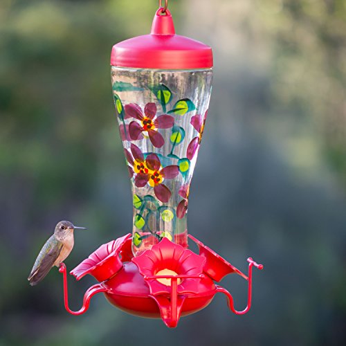 -. Feature : Hand-painted clear glass feeder with red accents / 4 flower-shaped feeding ports / Holds up to 10 ounces of nectar / Patented reversing funnel cap for easy filling and cleaning / Dimensions: 6.26W x 6.26D x 11.05H inches
