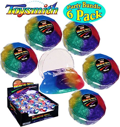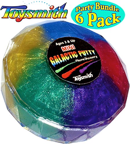 Studio : Toysmith Publisher : Toysmith Binding : Toy Product Description Toysmith Mini Galactic Rainbow Putty (Slime/Putty) Gift Set Party Bundle - 6 Pack, is AWESOME! Mini Galactic Putty comes to us from the stars of far off space. It's a gooey malleable substance that you can squish, stretch, tear and bounce. A Fun way for kids to exercise their hands! It's never sticky or slimy, so it won't make a mess on your desk. Plus it looks super cool with its swirly vibrant colors and a hint of cosmic shimmer. For a trip to the outer reaches of kid hand exercising fun, get some out-of-this-world space putty today. Makes a great gift is perfect for schools, party favors, stocking stuffers, baskets, special needs, promotions and so much more! For Ages 3 and up - Container's measure 1" tall x 2.25" diameter. - Mini Galactic Rainbow Putty will not stain furniture or carpets. 0