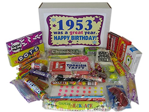 -. Binding : Misc. -. Brand : Woodstock Candy -. Feature : This birthday gift will bring back fun memories to someone who was born in 1953 / Filled with 30 kinds of candy from the past / Makes a great gift for someone who has everything / Box measures 9.5 x 7 x 3 inches and comes shrink wrapped -. IsAdultProduct : 0 -. Label : Woodstock Candy -. Manufacturer : Woodstock Candy -. PackageQuantity : 1 -. ProductGroup : Grocery -. ProductTypeName : GROCERY -. Publisher : Woodstock Candy -. Studio : Woodstock Candy -. Title : 1953 64th Birthday Gift Box of Retro Nostalgic Candy from Childhood for a 64 Year Old Man or Woman - 50s Decade Jr