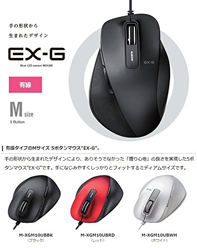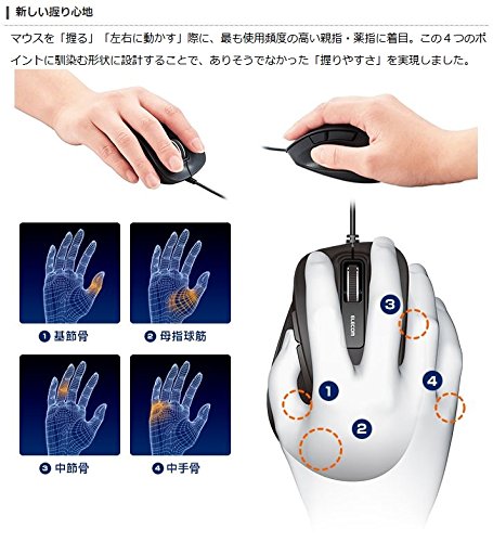 In design it was born from the shape of the hand realizing the goodness of further "grip comfort". Equipped with BlueLED that can be operated comfortably anywhere 5-button mouse that was realized by a wired type of 5-button mouse "EX-G" ◆ design was born from the shape of the hand a "grip ease" a were not likely It is "EX-G". ◆ It is medium in size secure fit easily familiar to the hand. ◆ focusing on the most frequently used thumb and ring finger during the mouse operation proximal phalanx thenar eminence middle phalanx it has been designed in the form that adapt to the four points of the metacarpal bone. ◆ By adopting the side grip of tone leather side of the body prevents the slip of the hand we have extended sense of quality as a tool. ◆ small light is reflected more accurately even in uneven and dust is equipped with a BlueLED that can be comfortably used in any place. ◆ It is resolution 2000 count to achieve a smooth and comfortable operation. ◆ increase the efficiency of the Web page browsing "Forward" it is a 5-button type equipped with a "back" button. ◆ position of the vertex angle by adjusting the area push-friendliness of the side button has been improved. ◆ The left and right buttons high reliability in durability even to click feeling has adopted the OMRON Corp. switch proven. ◆ can be downloaded for free by utilizing the "Elecom mouse Assistant" you can assign a function of your choice to each button. /