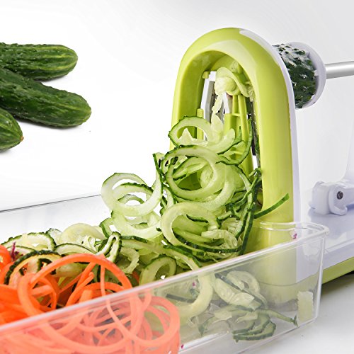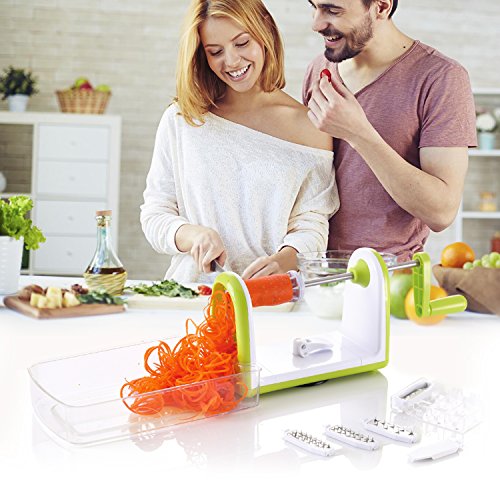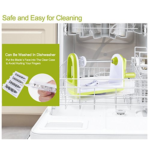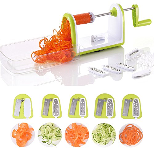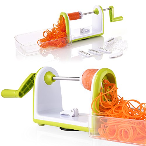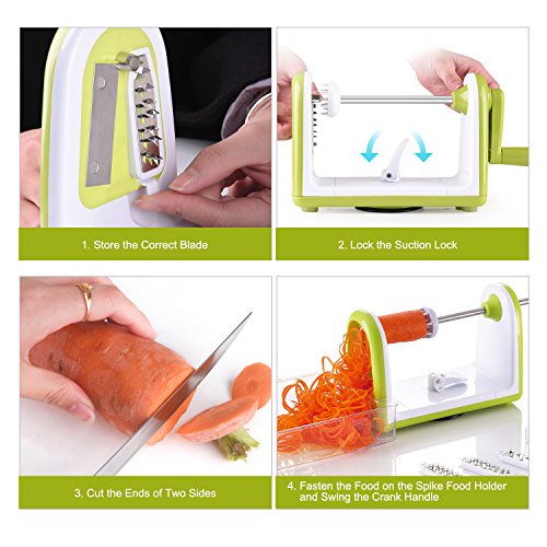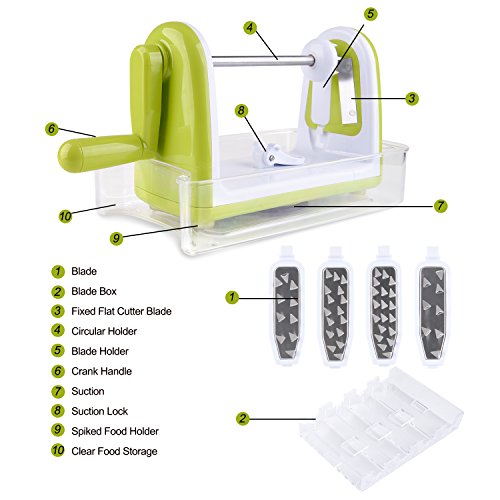 - Comes with 5 ultra sharp stainless steel blades, clearly labeled for all your spiralizing needs