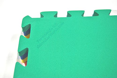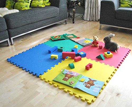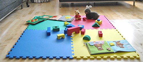 - Feature : • 4 piece 2' x 2' rainbow interlocking Formamide ND (non-detected) waterproof mats that create 16 square feet. Each Formamide ND mats is marked on the back. / Its ~9/16" of an inch thickness meets the minimum protection requirement for children. / Easy do-it-yourself interlocking mats. Lasts up to 5 years under proper care. / Have passed ASTM standards, including bite and choke tests, 53 substances of very high concern screening, and Formamide ND test. Will provide report upon request. / Made from non-recycled, non-toxic, light weight, durable, and high density EVA foam. Due to the nature of foam production, colors may fluctuate slightly in various angles and/or lighting.
