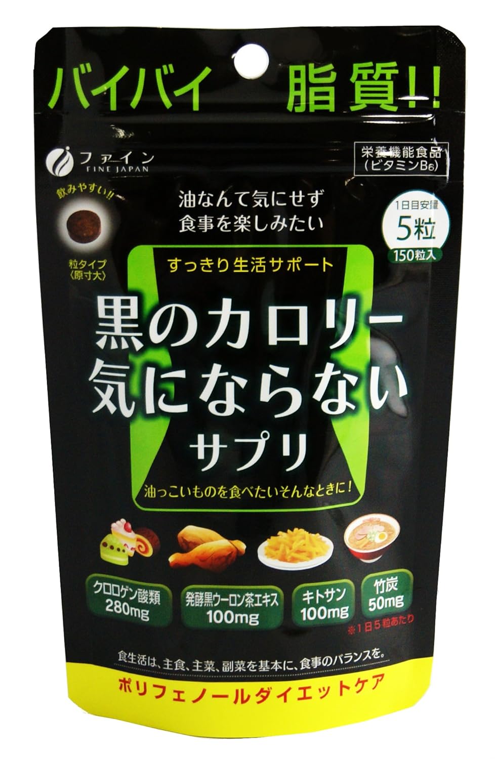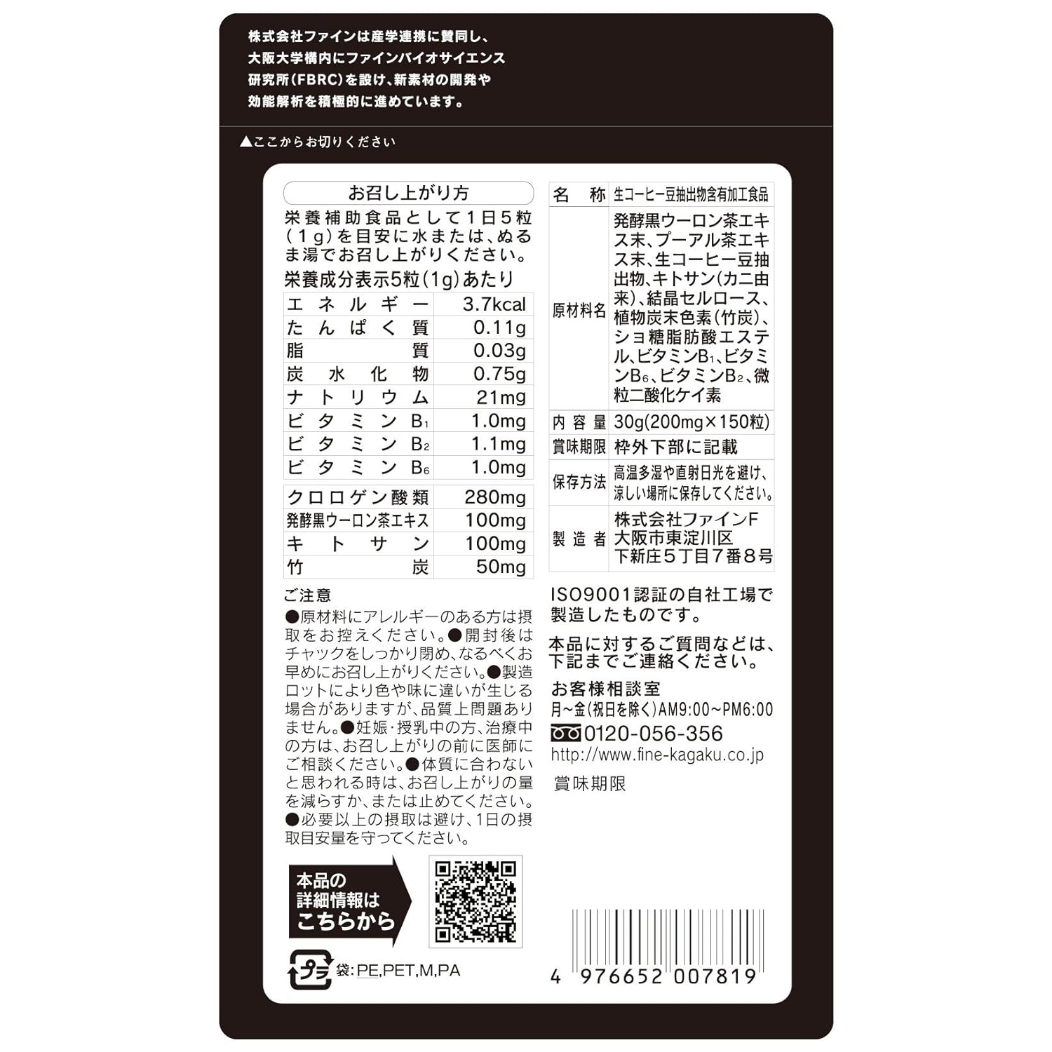 内容量 :30gカロリー :5粒あたり:エネルギー 3.7kcal、たんぱく質 0.11g、脂質 0.03g、炭水化物 0.75g、ナトリウム 21mg、ビタミンB1 1.0mg、ビタミンB2 1.1mg、ビタミンB6 1.0mg、クロロゲン酸類 280mg、発酵黒ウーロン茶エキス 100mg、キトサン 100mg、竹炭 50mg商品サイズ (幅×奥行×高さ) :100mm×20mm×167mm質量 :35