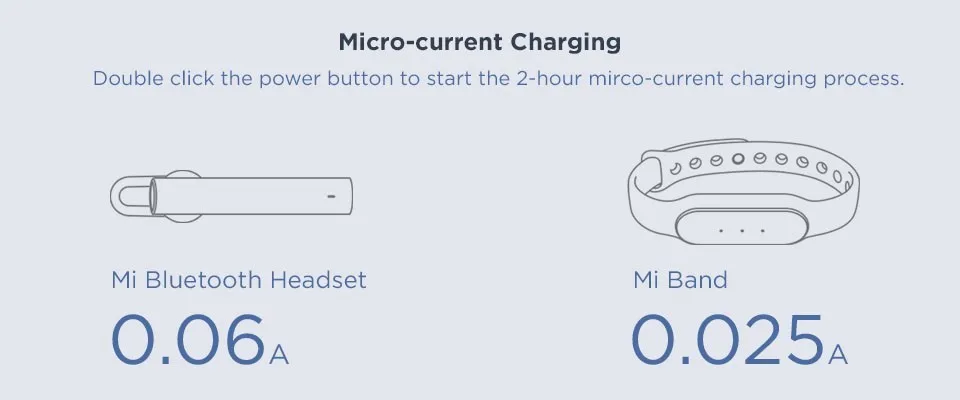- The Bluetooth headset and Xiaomi bracelet can be charged after double-click the button to open two hours charging current.
