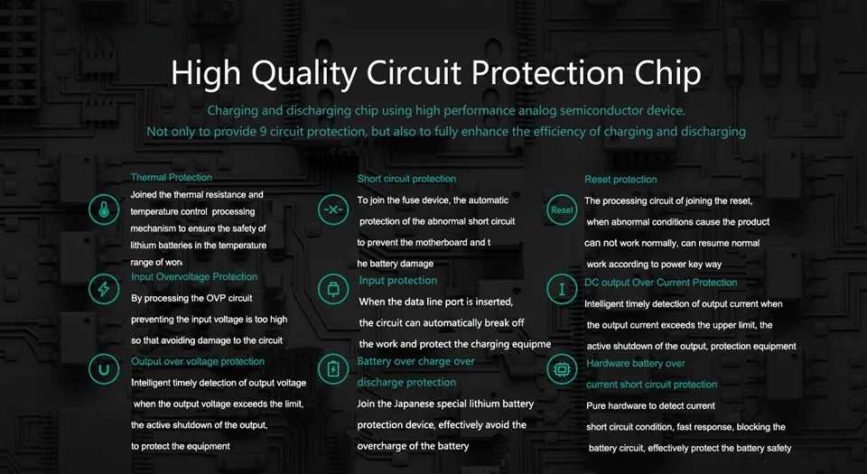 Safety Supports protection from over-voltage (input and output), over-current (input and output), short circuit, over-charge, over-discharge, and battery Positive Temperature Coefficient (PTC).