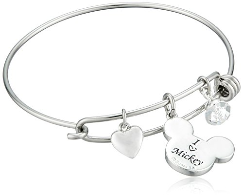 Disney Stainless Steel Catch Bangle with Silver Plated Crystal Mickey Mouse Head, "I Love Mickey" Heart and Crystal Bead Charm Bangle Bracelet