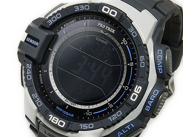 ソーラー充電システム「タフソーラー」搭載の「PRO TREK(プロトレック)」から、新開発『トリプルセンサーVer.3』※を搭載したNewモデルが登場。今回のモデルは、従来のトリプルセンサーモデル(PRG-110)に比べ、高度計測は計測間隔を5秒から1秒(最初の3分間のみ)に短縮、計測単位は5mから1mに向上させました。方位計測は、センサーの省電力化により連続計測時間を20秒から60秒に延長。この進化した計測機能とタフソーラー/10気圧防水といった基本性能を組み合わせることで、刻々と状況が変化する過酷なアウトドアシーンでの使用に堪えうるスペックを実現しました。また、グローブ着用時でもワンプッシュで各機能が計測可能な大型ダイレクトボタンを搭載し、実用性も向上させています。更に、過去の気圧傾向分析に基づき、気圧の急下降や急上昇など注目すべき変化があった場合にはアラームで知らせる、気圧傾向インフォメーションアラーム機能を搭載。気が付きにくい気圧の変化をいち早く把握することが可能になりました。計測機能、実用性を追求したNewプロトレックの誕生です。プレゼントやギフトにもおすすめ。