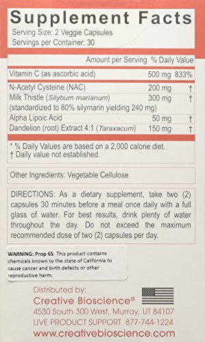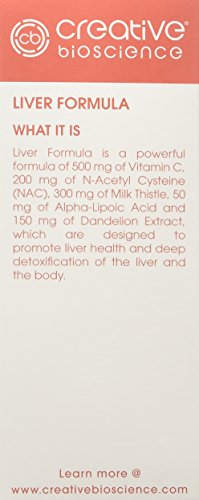 Creative Bioscience Liver Formula, 60 Veggie Capsules. Liver Formula is a powerful formula of 500 mg of Vitamin C, 200 mg of N-Acetyl Cysteine (NAC), 300 mg of Milk Thistle, 50 mg of Alpha-Lipoic Acid and 150 mg of Dandelion Extract, which is designed to promote liver health and deep detoxification of the liver and the bodyFeature