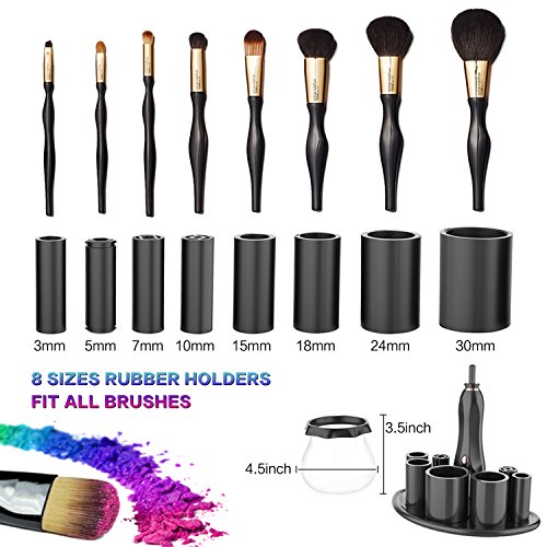 - 8 SIZES RUBBER HOLDERS FIT ALL BRUSHES.this makeup brush cleaner automatic clean and dry sizes from 3mm to 32mm rushes even painting brushes just match the rubber holders, keep your brushes clean soft and last long time, preventing water spattering out during cleaning drying cosmetic brushes,the makeup bruch cleaner easily carry for travel use,keep away from your hands getting wet and dirty.