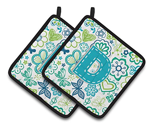 Caroline's Treasures Letter D Flowers & Butterflies Teal Blue Pair of Pot Holders CJ2006-DPTHD, 7.5HX7.5W, Multicolor