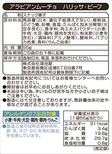 原材料:馬鈴薯(日本:遺伝子組換えでない)、植物油、ぶどう糖、砂糖、食塩、たんぱく加水分解物(大豆を含む)、香辛料、肉エキスパウダー(小麦・牛肉・大豆・鶏肉・豚肉を含む)、粉末酢(小麦を含む)/調味料(アミノ酸等)、酸味料、パプリカ色素、香料(りんご由来)