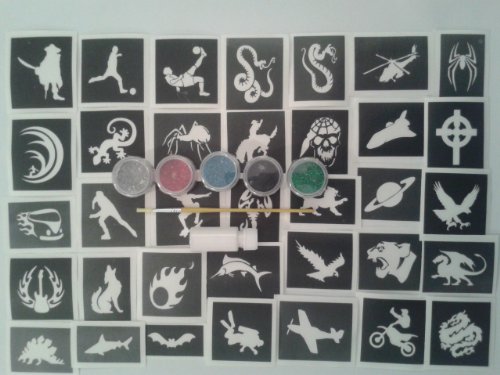 Studio : Body Art Desire Publisher : Body Art Desire Binding : Toy Product Description boys themed mini glitter tattoo stencils set include 50 stencils 5 glitter colors Mini small size - approx. 2.5 cm x 2.5 cm. (1" x 1"). A really good range and most can be used many times over. Includes 5 glitter colors, 1 pot of 14 ml prosaide body glue adhesive, 1 brush and instruction sheet. Ideal for birthday present, fundraising events, children's parties or adding to your entertainment business as a new avenue! 0