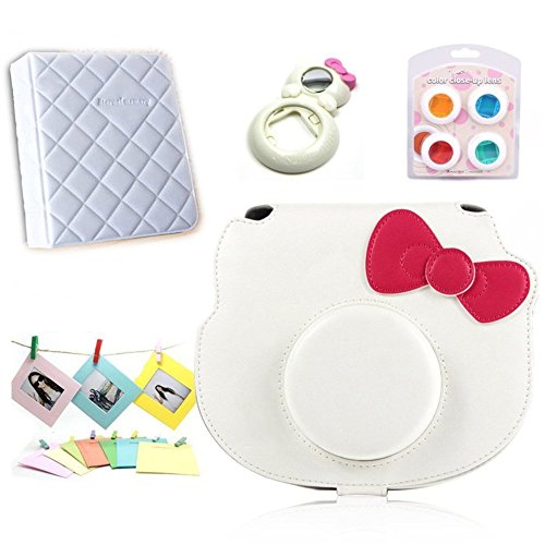 You deserve it. This bundles set includes some of the essential accessories you need Save when you buy this bundles set. Fashion,cute and useful -great as a his and her gift . Package includes: 1 x Fujifilm instax mini hello kitty case bag. To protect your mini hello kitty, you can put it into the case bag. 1 x hello kitty design close-up lens(self-portrait mirror). 1 x colorful close-up lens(filter) for mini hello kitty,4 colors. You can use the self-portrait mirror to take self photos. Besides, the colorful filter can color your photos, make them outstanding. 1 x instax mini book album 64 photos. Photos taken, you can put them in the album for preserve. Book album style,archival and protective. 1 x colorful wall decor hanging frame,l0 pcs. You can also put them to the frame to show your best photos. The wall decor hanging frame even allow you to hang pictures on the wall. Different colors to choose, good for room decoration.Feature