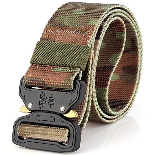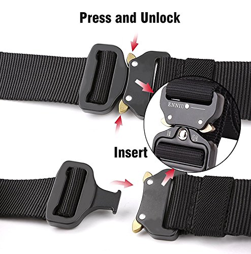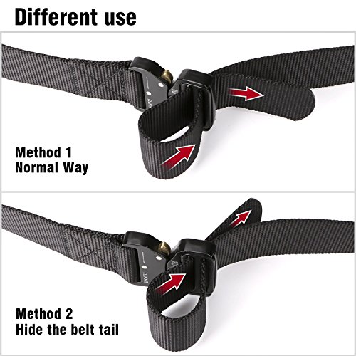 -. Feature : Durable Material: The solid buckle of this tactical belt made of Zinc Alloy material which is firm, scratch resistant and anti-rust for sports and outing. The 3.6mm thick webbing made from environmental friendly nylon, which is soft, breathable and comfortable for daily use. / Convenient Tactical Belt: This stab-lock style Cobra Belt quick to release but not easy to slide and move.It is suitable for many outdoor activities like fishing, hunting, camping or outdoor wokers like policemen, firefighter or just daily casual using. / Easy to use: Its stab-lock style let buckle quick release by pushing the golden tabs down. / Upgraded Tacticle Belt: No-Hole-Design allows you adjust it to your waist.Adjustable length also makes the belt fits your waist better. / This Cobra Belt goes well with any Jeans and Work Pants.