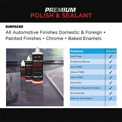 ReleaseDate : 2017-09-20 Studio : Rolite Company Publisher : Rolite Company Binding : Misc. Product Description Rolite Premium Polish Sealant this unique formula contains special polymers to level the surface, seal in the shine and protect the finish even from ultraviolet rays and acid rain. Contains no harsh abrasives, acids or solvents that can harm painted finishes. Special cleaners remove oxidation, dirt and pollutants to restore the original luster. Safe for all auto finishes, domestic and foreign, including acrylics, baked enamels, clear coats and metallics. NOT recommended for use on flat black paint or black textured trim. Always check colorfastness of decals and stripes before applying. Directions: SHAKE WELL BEFORE USING. Wash and dry surface before applying. Pour onto a clean, damp cloth. Apply to a section at a time using a firm circular motion. Allow to dry to a haze. Buff off residue with a clean, dry, microfiber cloth. With an electric polisher, apply to surface and buff to shine. Additional coats may be applied for added protection and deeper shine. 0