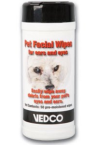 -. Feature : Gentle, pre-moistened wipes / Formulated to help remove tear stains and matter that accumulate around a pet's eyes and outer ears. / 50 Pre-Moistened wipes per container / Packaged in a pop-up dispensing canister with a flip top. / Wipes measure 7" x 8"