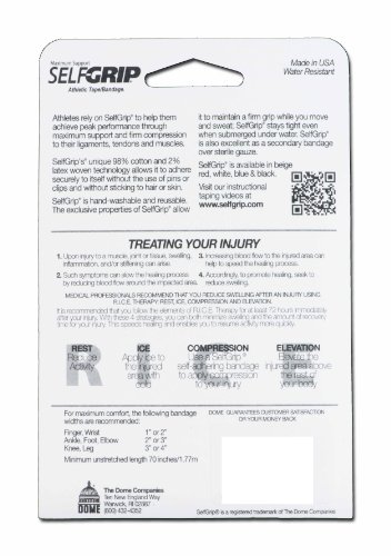 -. Feature : SelfGrip sticks to itself, not to skin or hair, so shaving and under wrapping aren't necessary as with white tape. / SelfGrip tears easily and evenly, so you use only what you need. / SelfGrip won't slip, even under water. Better still it's reusable for superior economics. / You can't buy a better tape. You want your team to play well. You need them to feel healthy and confident. Protect them with the tape that's built to provide maximum support and compression with flexibility. SelfGrip is used by the Wrangler Rodeo and the U.S. Men's & Women's Professional Volleyball teams. No clips to fuss with, no sticky tape, no baggy bandages.
