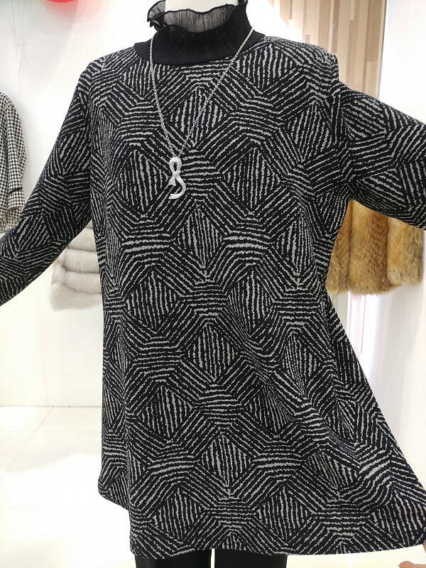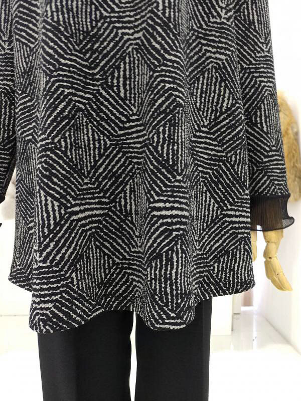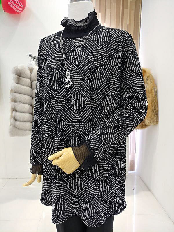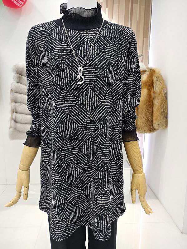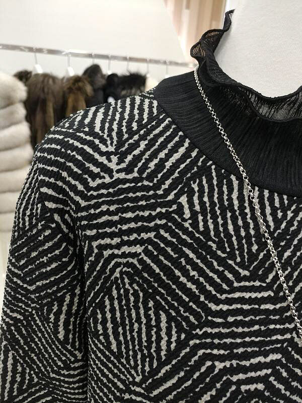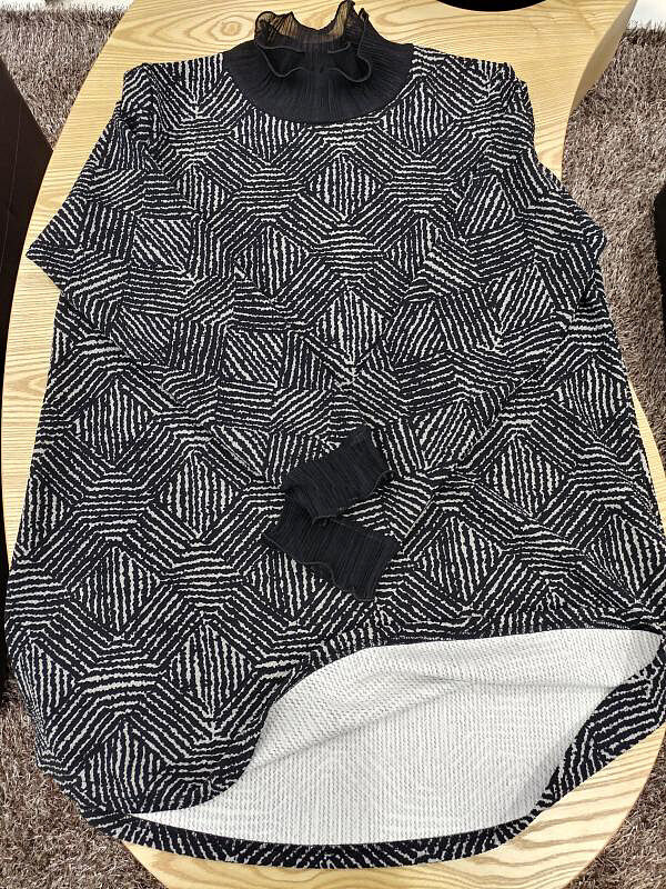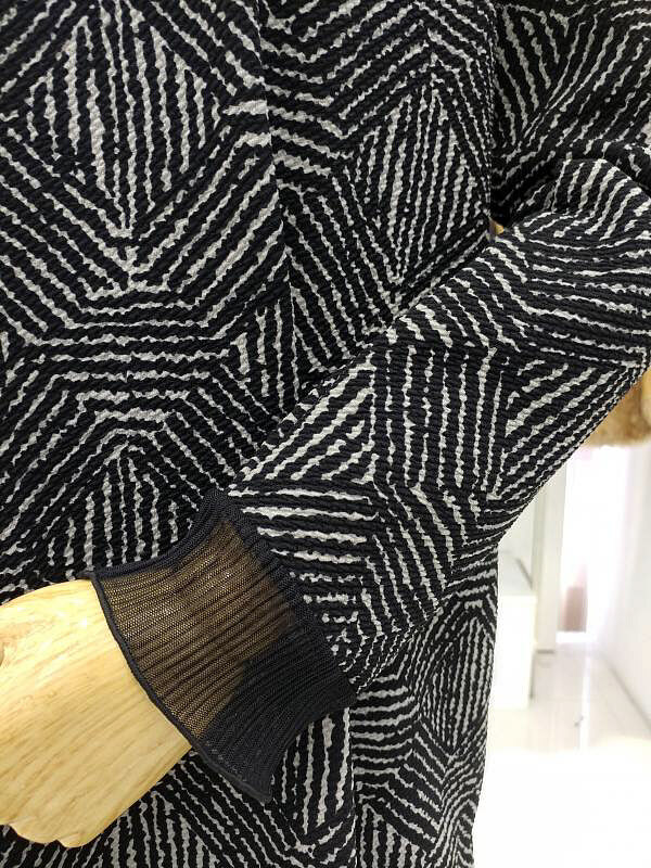 네크라인이 하이넥으로 프릴을 트리밍하고 프릴에 주름이 있어 자연스러운 분위기를 주는 본 제품은