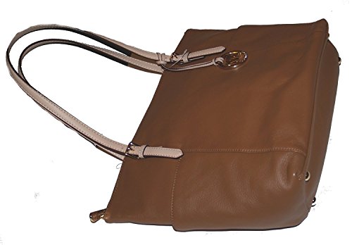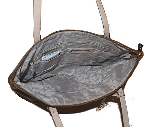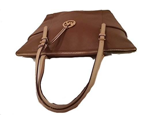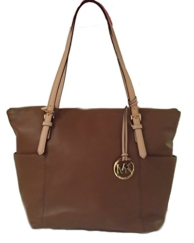 -. Binding : Apparel -. Brand : -. Color : Lage -. Department : womens -. EAN : 0885949835230 -. Feature : Lage brown leather with tan leather trim and golden hardware / Lined interior with zippered pocket and 4 open slip pockets / Zippered top closure; side gusset pockets / Dual leather straps with a drop of about 8" / Measures approximately 11" (L) at the bottom tapering to 15" (L) at the top x 11.5" (H) x 4" (W) -. Model : 35T2GTTT8L -. ProductGroup : Shoes -. ProductTypeName : BAG -. Size : Medium -. Title : Jet Set East West Top Zip Brown Leather Tote -. UPC : 885949835230