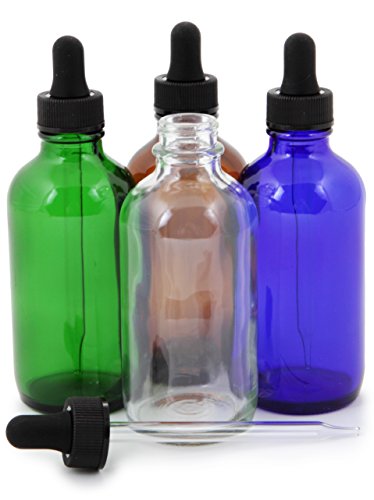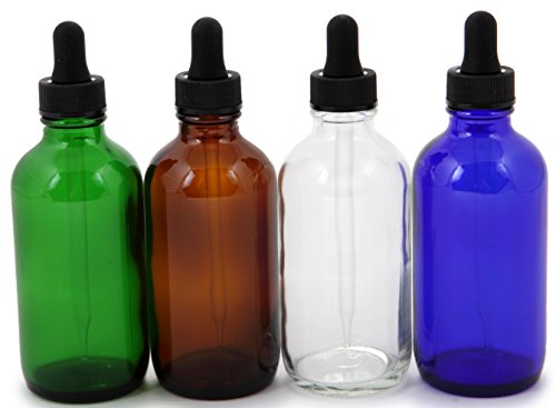 - 8 - 4 oz, Assorted Colors (Clear, Amber, Cobalt Blue, Green) Glass Bottles, with Glass Eye Droppers