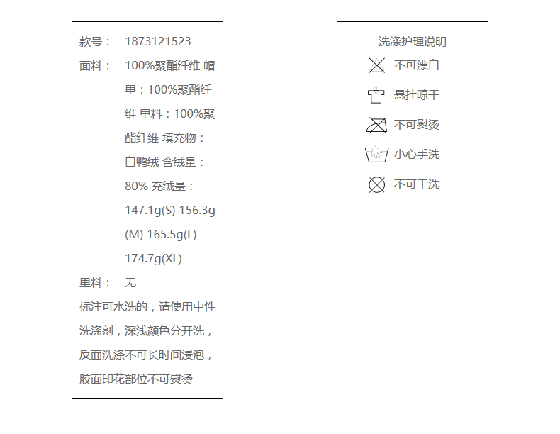 100%聚酯纤维 帽里:100%聚酯纤维 里料:100%聚酯纤维 填充物:白鸭绒 含绒量:80% 充绒量:147.1g(S) 156.3g(M) 165.5g(L) 174.7g(XL)