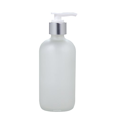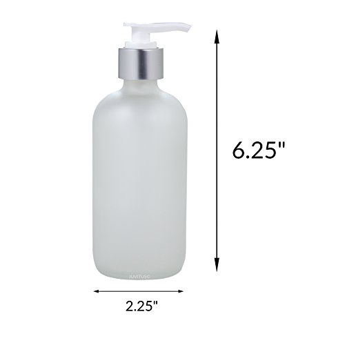 8 oz Frosted Clear Glass Boston Round Bottle with Silver and White Lotion Pump (6 Pack) + Labels