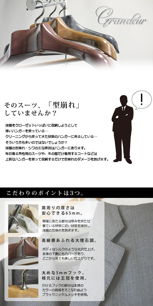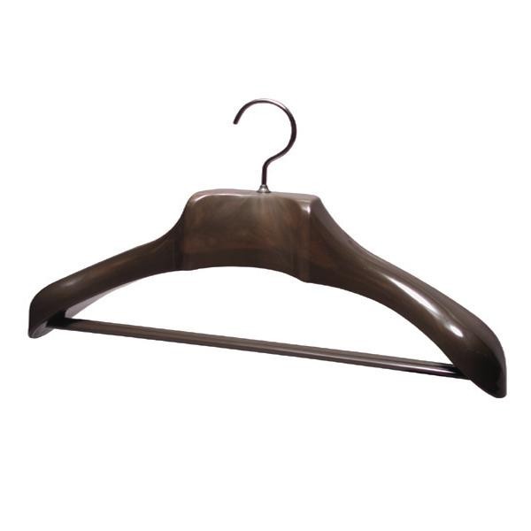 | 肩周りに十分な厚みと、背中の丸みにあわせたすこし湾曲しているフォルムが、コートやジャケットの型崩れをふせぎます。かけるフックの部分は本体のカラーと質感をそこなわぬよう配慮しました。またフックは回転しますので収納に便利です。カビ防止加工が施されていますので、お手入れも簡単です。 |