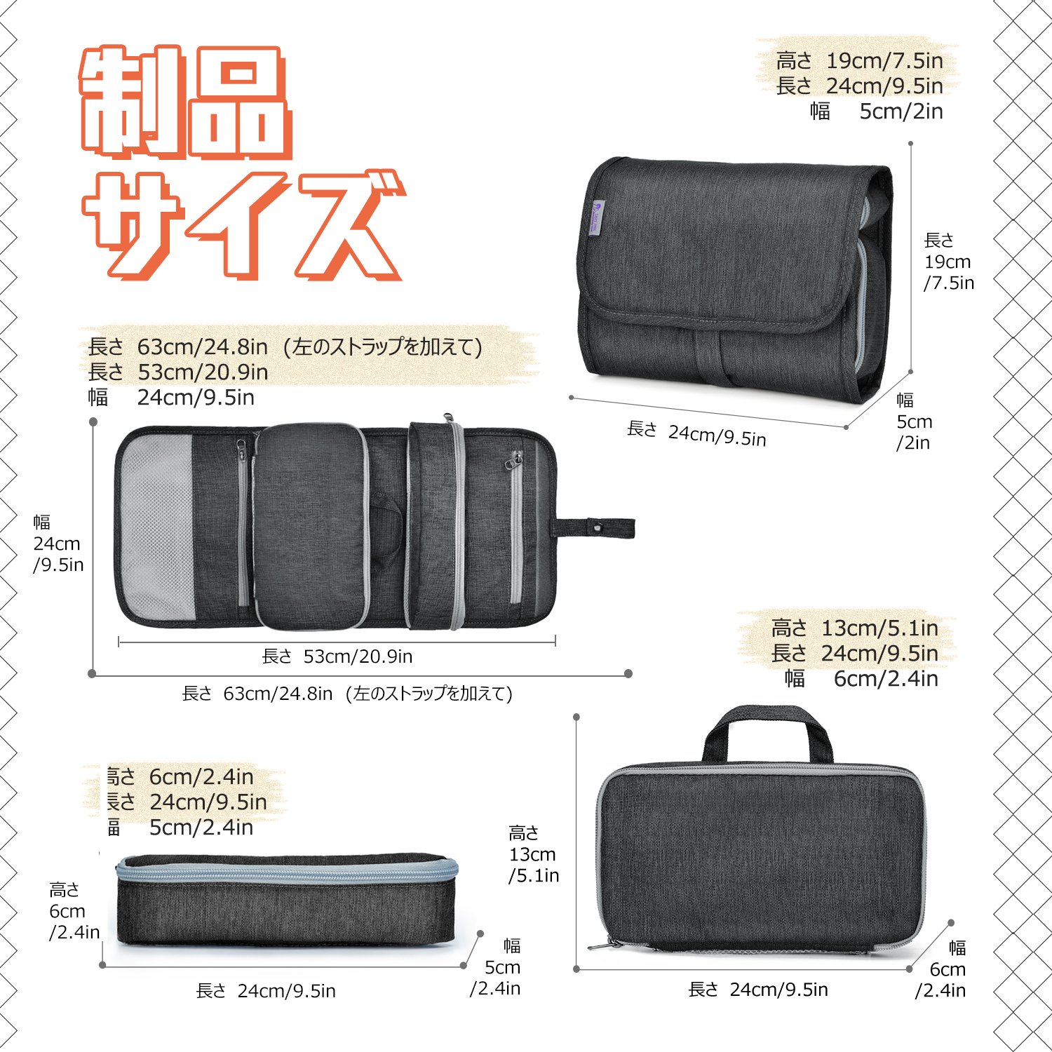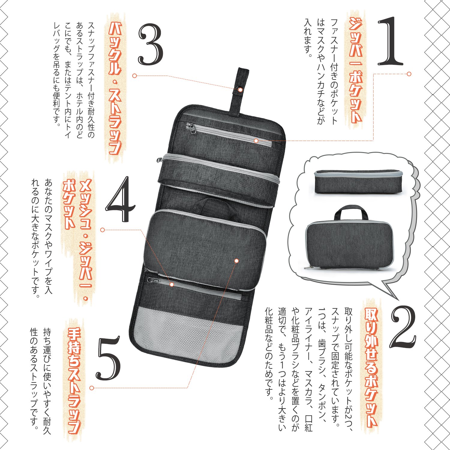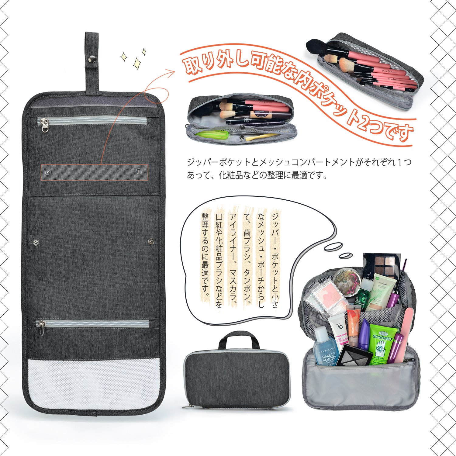 Removable pockets (2): Toothbrush, tampon, eyeliner, mascara, lip cream, cosmetic brush etc. are appropriate, the other is for large items such as cosmetics.