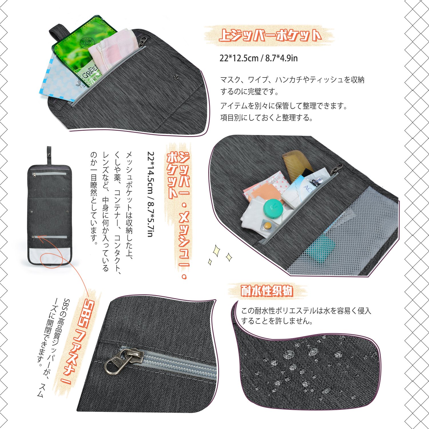 Mesh, zipper, pocket: Since it is a mesh pocket, you can see items such as medicine, container and contact.