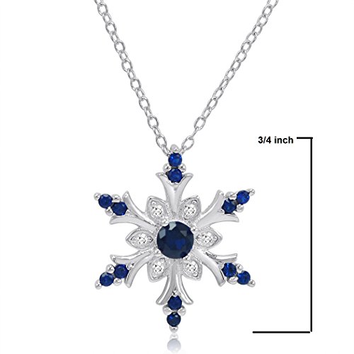 - Feature : Created Blue and White Sapphire / Sterling Silver setting and 18in chain. / Snowflake measures 3/4 inch