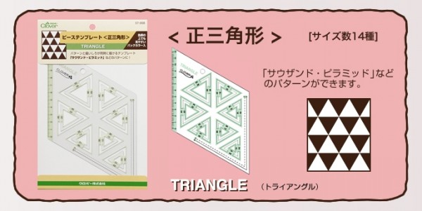 ピースドキルトのお手伝い。お好きなサイズのパターンが作れます。布や紙などの作図をしたいところにピーステンプレートを置いて、必要なパターンサイズをなぞります。ワンパッチなどの作品作りに便利です。「サウザンド・ピラミッド」等のパターンができます。 |