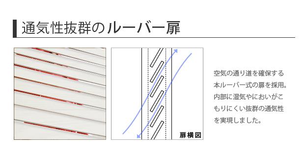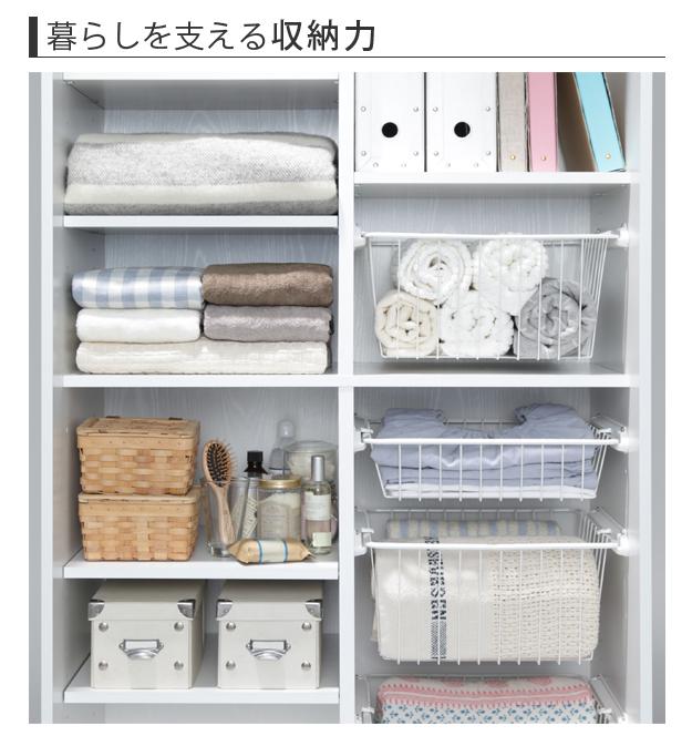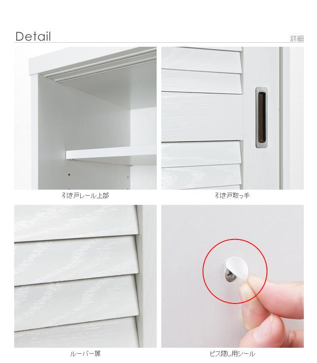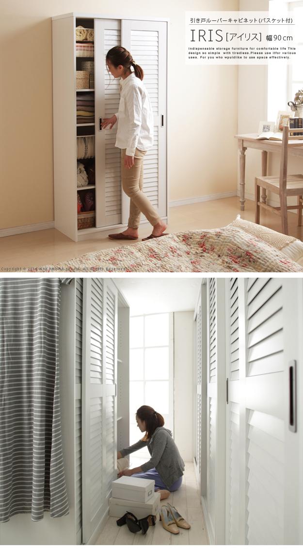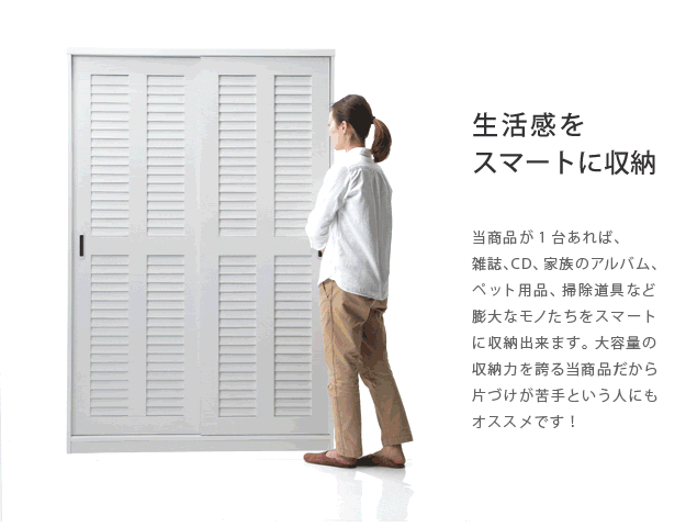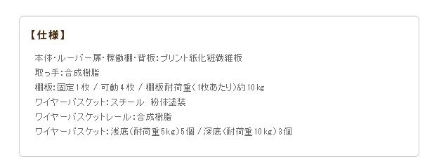商品について:引き戸ルーバー扉のバスケット付き収納。引き戸タイプなので扉の開閉スペースがとれない場所にも設置OK。湿気がこもりにくく、通気性に優れたルーバー扉仕様。場所を選ばず様々な収納に対応します。可動棚と引出し式ワイヤーバスケットはレイアウト自在☆収納する物に合わせて位置や高さが調節できます。棚板(固定x1・可動x4)、バスケット(深x3・浅x5)
