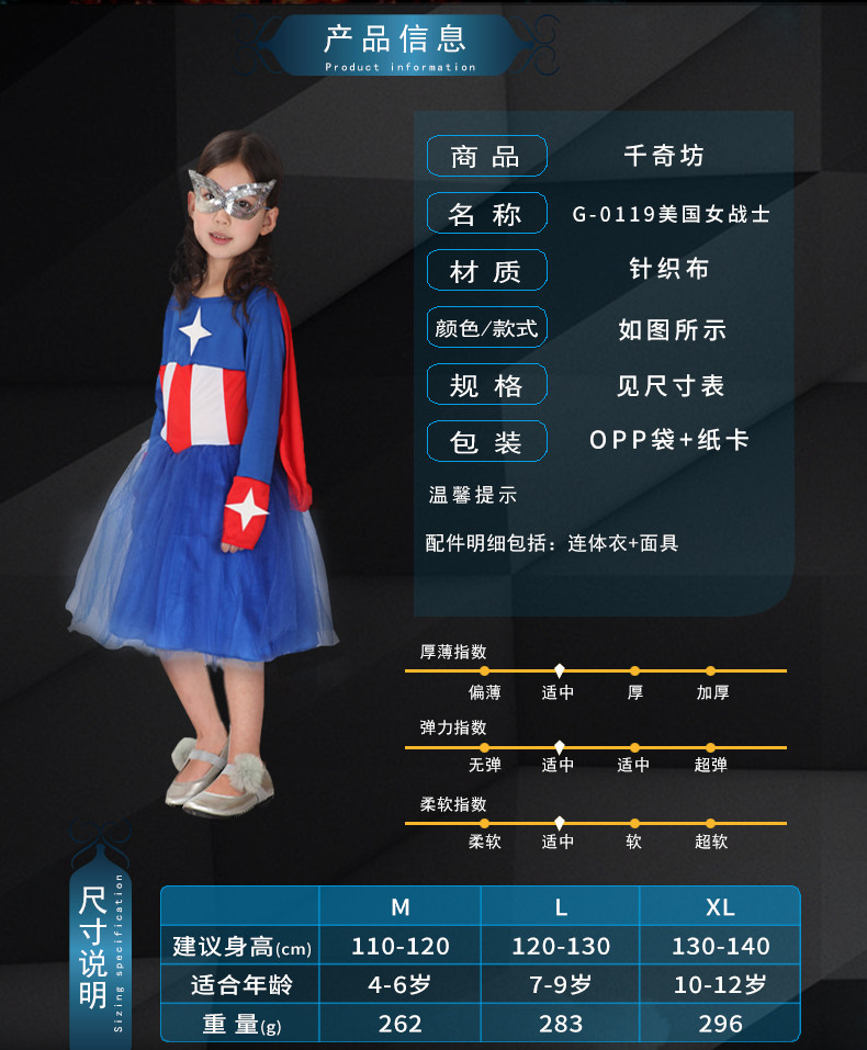 Size: M number, the recommended age 4-6 years old, height around 110-120cm, weight 300 g,