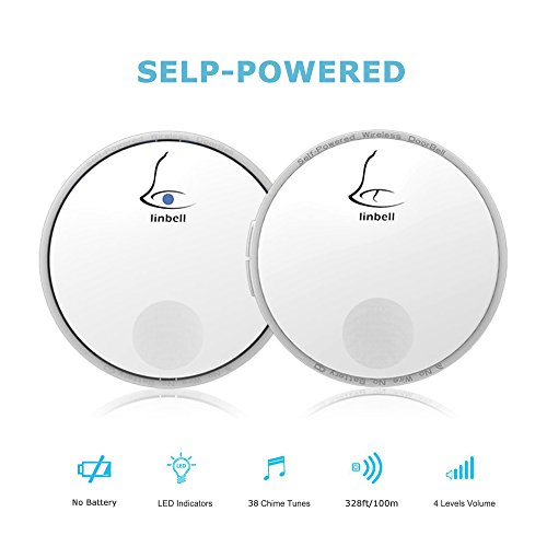 Wireless Doorbell, Battery-free Waterproof Doorbell Kit, Selp-Powered and Operating at over 100m with 38 Chimes, 4 Level Volume, 1 Reveiver and 1 Transmitter(No Battery No Limits)