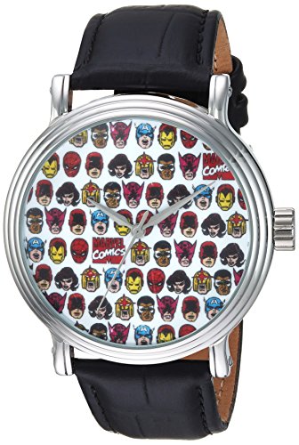 Item model number: WMA000046 Batteries: 1 Nonstandard Battery batteries required. (included) Date first listed on Amazon: June 21, 2017 Brand, Seller, or Collection Name:Marvel Model number:WMA000046 Part Number:WMA000046 Item Shape:Round Dial window material type:Mineral Display Type:Analog Clasp:Buckle Case material:Metal Case diameter:42 millimeters Case Thickness:12 millimeters Band Material:Synthetic leather Band length:9.75 inches Band width:22 millimeters Band Color:Black Dial color:White Bezel material:Metal Bezel function:Stationary Movement:Analog quartz Water resistant depth:100 Feet