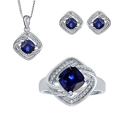 Glisten with the elegant and timeless design of this Gemstone and diamond accent jewelry set. The earrings, pendant, and ring each feature a stunning cushion-cut Gemstone set into a halo of glittering white diamonds. This sturdy rhodium plated brass bodies of each jewelry piece, highlighting them with delicate filigree accents for a radiant look.Feature