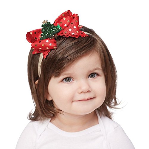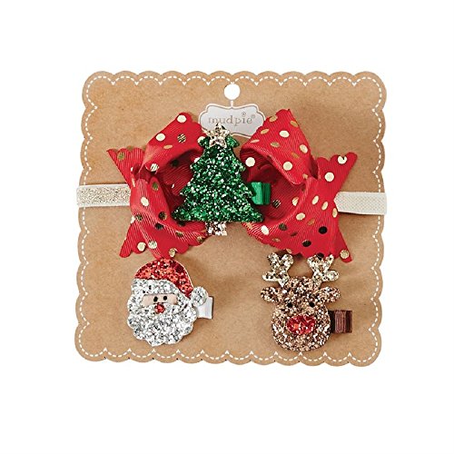 Product Description4-piece set. Interchangeable sparkle tree, Santa and reindeer clips top gold dot grosgrain bow on gold elastic headband.0