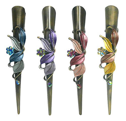 -. Feature : Set of 4 alligator hair clips, 1 each of 4 colors / decorated with colorful leaves and sparkling crystals / metal clip with saw toothed edge for strong grip on hair / work well with thick and slick hair / alligator hair clip is 5.25" in length