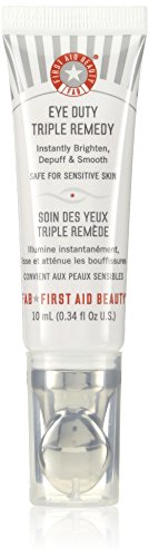 -. Binding : Health and Beauty -. Brand : First Aid Beauty -. Color : fair/medium -. EAN : 0885790549119 -. Feature : 0.34 oz / An eye treatment that instantly brightens, depuffs and smooths / Eye Duty Triple Remedy is packed with a host of age defying ingredients. / Eyes immediately appear brighter, larger and more awake with visibly reduced puffiness and undereye circles. Over time, fine lines and wrinkles become softer and less pronounced for a more youthful appearance. / No Parabens, Harsh Chemicals or Colorants. -. Label : First Aid Beauty -. Manufacturer : First Aid Beauty -. Model : 298UK -. MPN : 298UK -. NumberOfItems : 1 -. PackageQuantity : 1 -. PartNumber : 298UK -. ProductGroup : Beauty -. ProductTypeName : BEAUTY -. Publisher : First Aid Beauty -. Size : N/A -. Studio : First Aid Beauty -. Title : First Aid Beauty Eye Duty Triple Remedy- 0.34 fl oz -. UPC : 851939002937