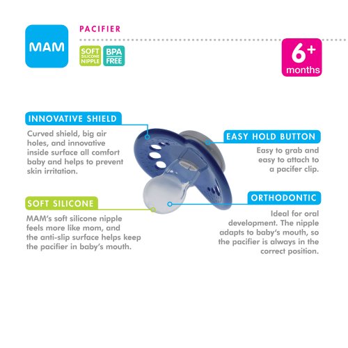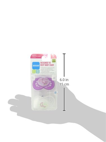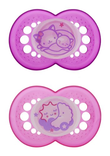 -. Binding : Baby Product -. Brand : MAM -. Color : Girl -. Department : baby-girls -. EAN : 0845296021649 -. Feature : Two BPA-free pacifiers / Curved shield allows the pacifier to sit comfortably on baby's face / MAM Ultra Soft Silicone Nipple stays comfortably in baby's mouth due to the anti-slip texture / Symmetrical nipple ideal for baby's jaw development / Textured surface and multiple small openings on the pacifier shield allow air to circulate and baby's skin to breathe -. IsAdultProduct : 0 -. Label : MAM -. Manufacturer : MAM -. Model : 2164-012-0-1 -. MPN : 2164-012-0-1 -. PackageQuantity : 1 -. PartNumber : 2164-012-0-1 -. ProductGroup : Baby Product -. ProductTypeName : BABY_PRODUCT -. Publisher : MAM -. ReleaseDate : 2013-07-03 -. Size : 6 Plus Months -. Studio : MAM -. Title : MAM Glow in the Dark Night Orthodontic Pacifier, Girl, 6+ Months, 2-Count -. UPC : 845296021649
