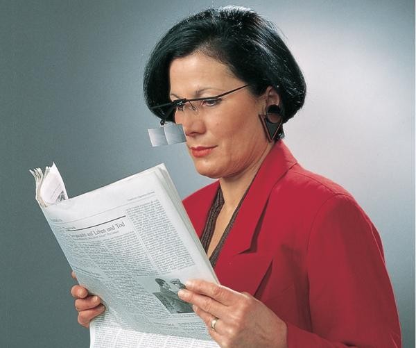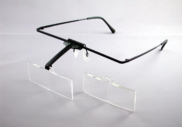 軽合金フレームだから、軽い掛け心地で眼鏡のように耳に掛けて使います。お持ちの眼鏡の上に重ねても使え、アームの部分は位置の調節ができます。倍率によって作業距離(焦点距離)が異なります。 |