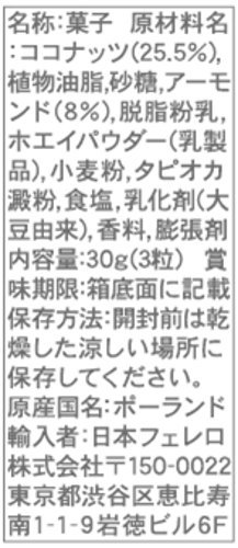 原材料:ココナッツ(25.5%)、植物油脂、砂糖、アーモンド(8%)、脱脂粉乳、ホエイパウダー(乳製品)、小麦粉、タピオカ澱粉、食塩、乳化剤(大豆由来)、香料、膨張剤