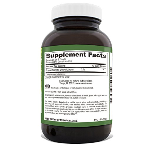 This 100% organic spirulina supplement from Natural Nutra is gluten-free, vegan, and vegetarian. There are no artificial colorings, flavorings, preservatives, milk, eggs, peanuts, tree nuts, soy, shellfish, or fish.